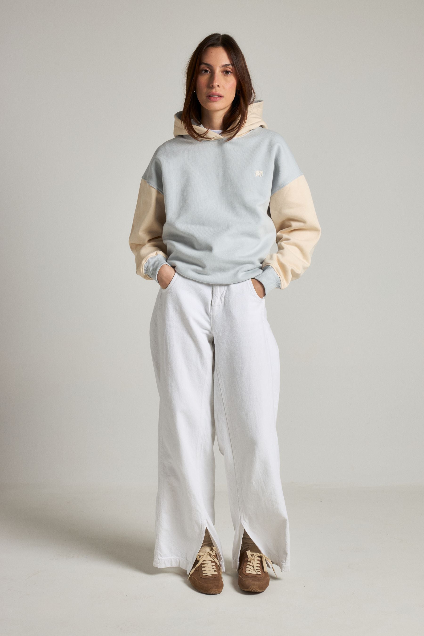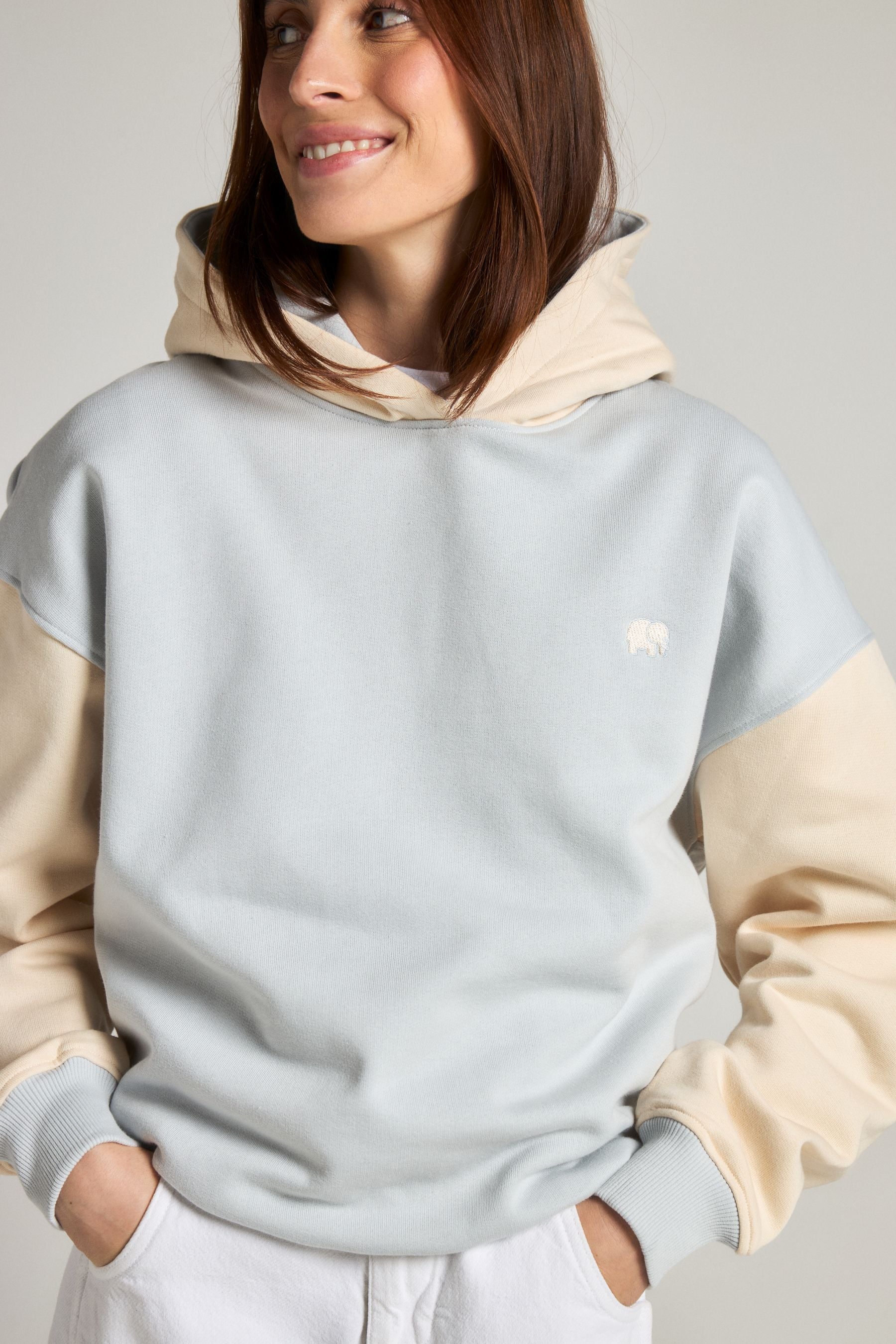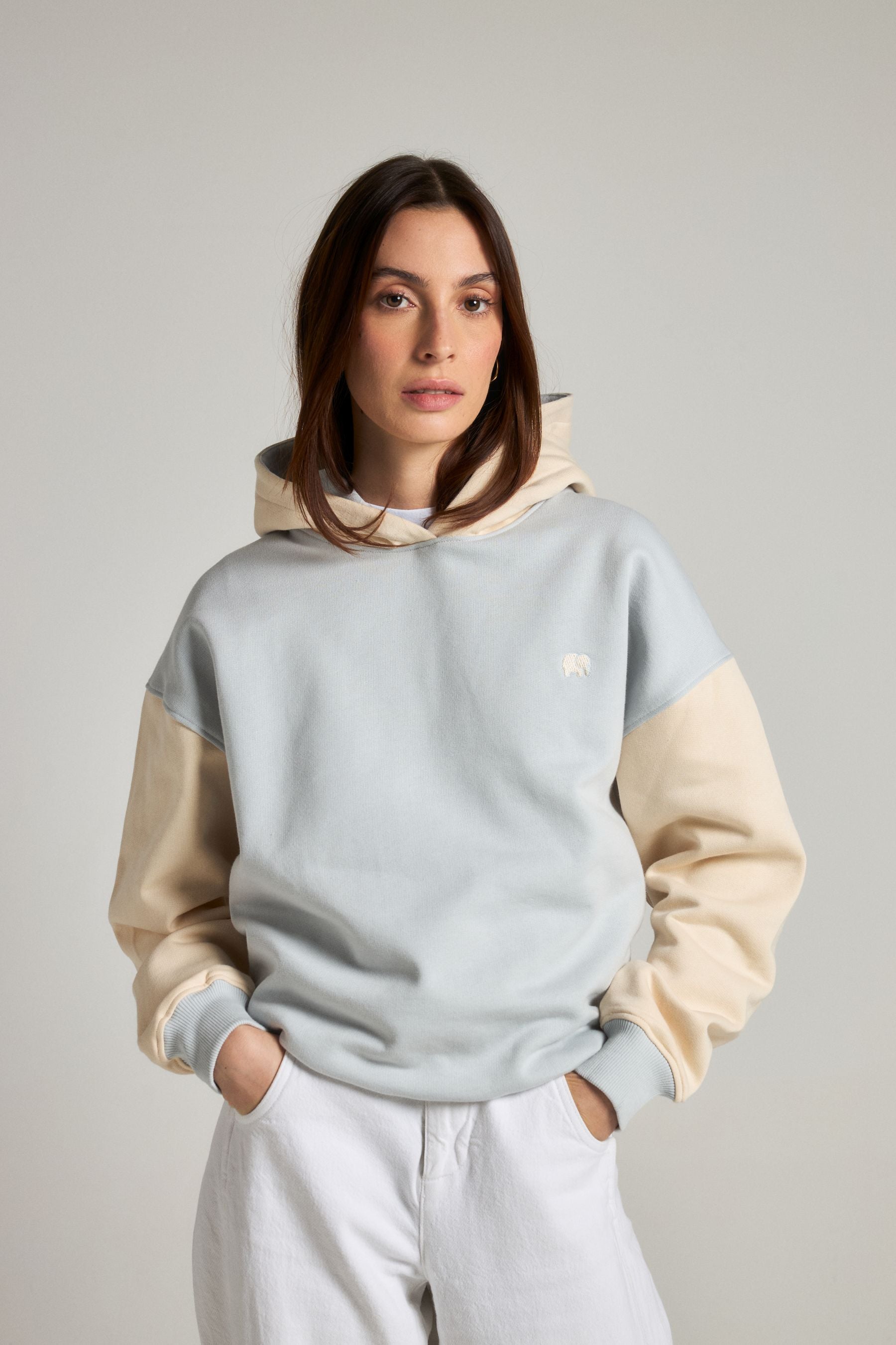 The hoodie draws inspiration from production leftovers, evolving into a timeless collection with its Color Blocks, offering a sophisticated yet vibrant appearance. Designed with an elephant motif, it symbolizes robustness and a nomadic spirit, perfect for those who value both style and substance.