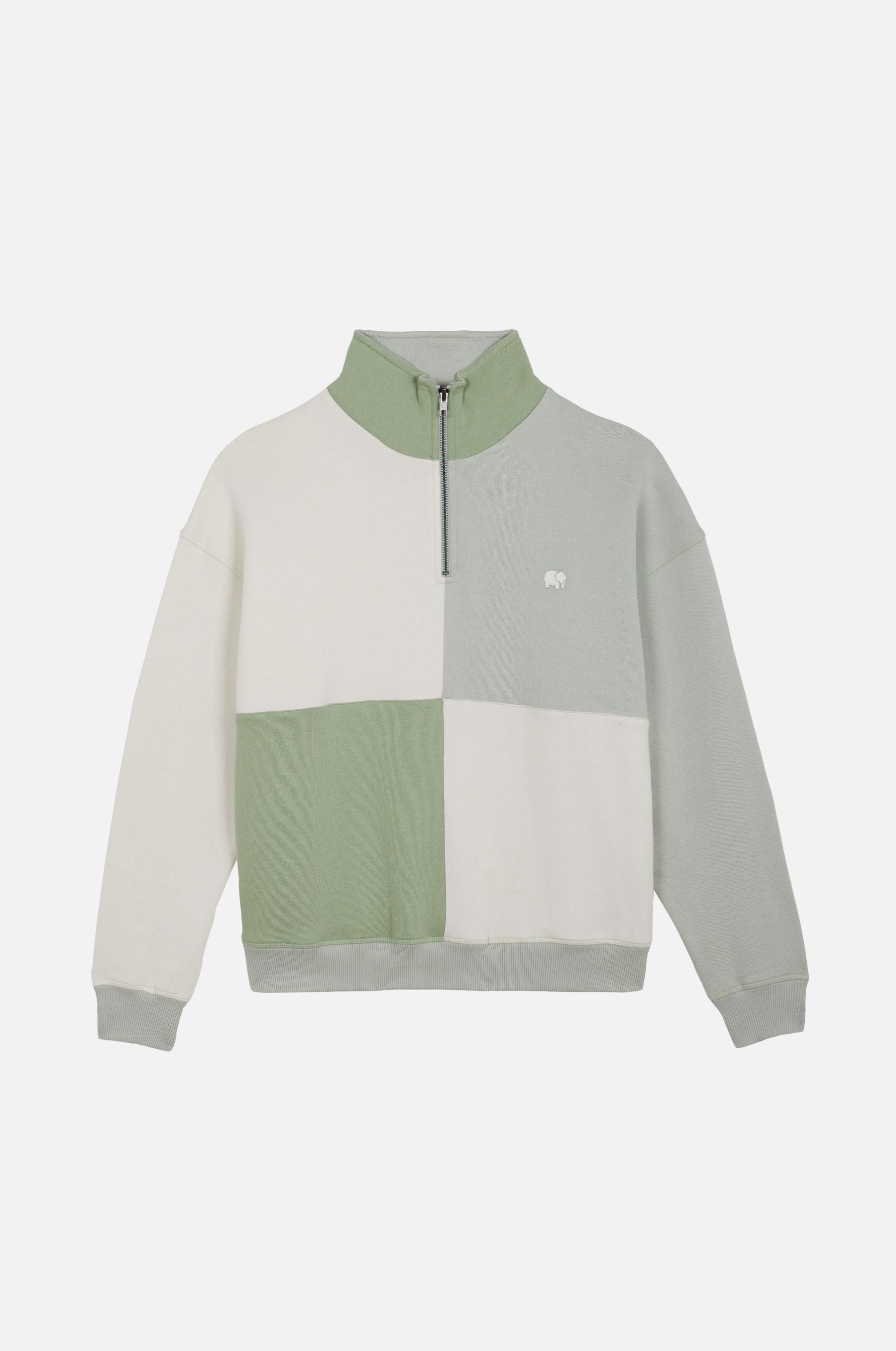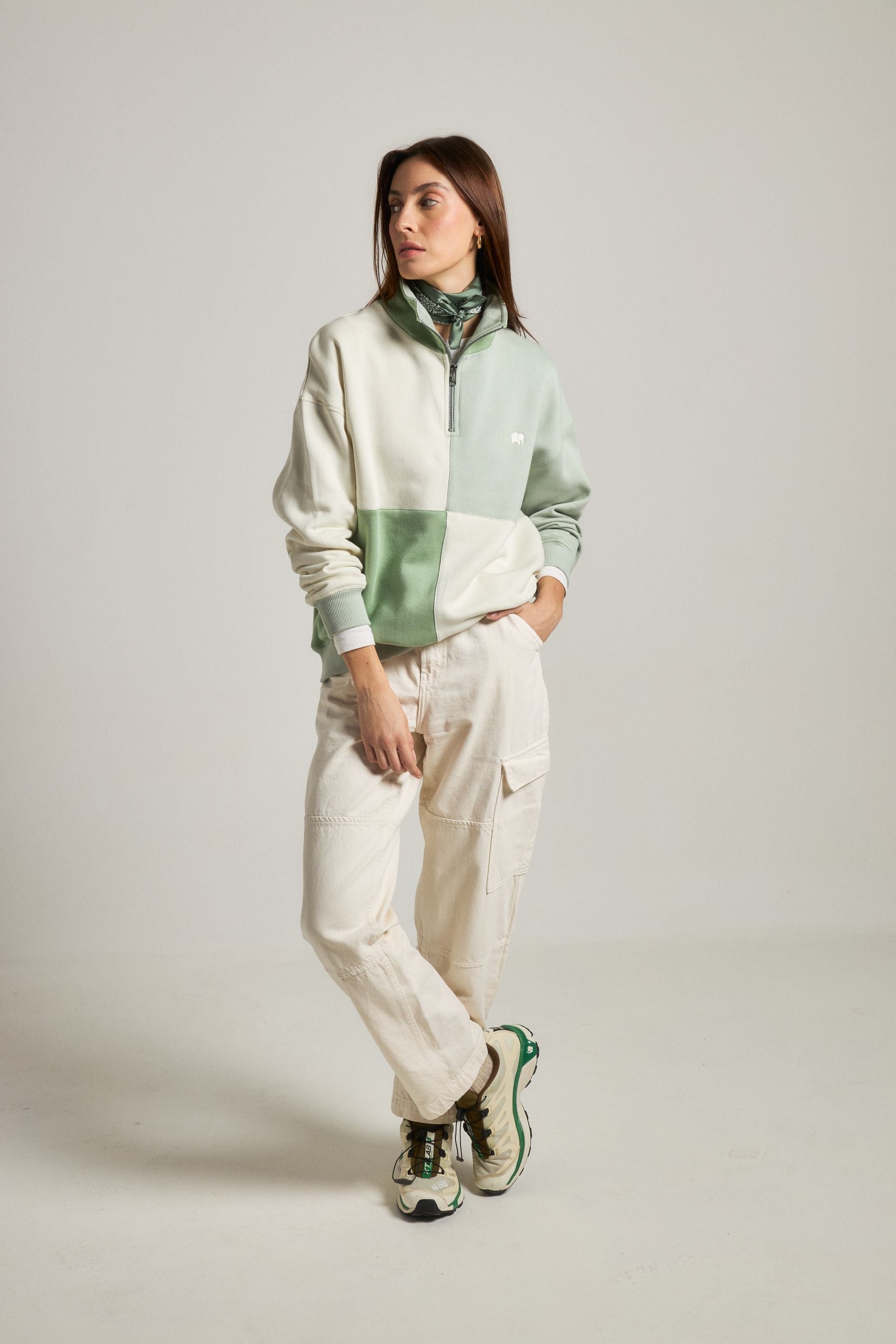 Crafted from premium brushed American Terry Knit, this Women's Oversized Quarter Zip Sweater embraces both comfort and style. Made in Portugal, it features 100% organic cotton to ensure a gentle touch on the skin and a nod to sustainable practices. The loose fit and graphic color blocking draw inspiration from the serene blend of sea and forest, evoking misty Mediterranean mornings. Ideal for layering, its calm palette of green, grey, and blue adds a soothing yet contemporary edge to any wardrobe.